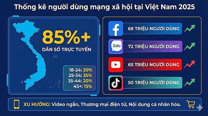 Số liệu từ DataReportal cho biết, vào thời điểm cuối năm 2025, VN có khoảng 127 triệu kết nối di động đang hoạt động, tương đương 126% dân số. Đồng thời số người sử dụng internet là 89.6 triệu người, chiếm hơn 85% dân số có kết nối trực tuyến. Riêng về các MXH: Facebook có 68 triệu người dùng tại VN, Zalo 72 triệu người, YouTube 65 triệu người, VN cũng đứng thứ 6 trong top 10 quốc gia có lượng người dùng TikTok lớn nhất thế giới, với khoảng 50 triệu người dùng.