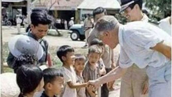 Ảnh minh họa: Phó Tổng thống Mỹ Hubert Humphrey thăm một làng quê ở miền Nam năm 1966 và được một nhóm trẻ em đón chào. Một em bắt tay Phó Tổng thống rất tự nhiên, trong một tư thế đứng thẳng người. (Nguồn: hdvietnam.de)