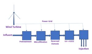 Mỗi nhà máy của MD-GWRS cần khoảng 50 MW công suất điện gió được lắp đặt để đáp ứng nhu cầu năng lượng 353,7 MWh/ngày. Mười tuabin 5 MW đặt ở vị trí chiến lược dọc theo bờ biển phía đông của Đồng bằng Sông Cửu long, có thể khai thác năng lượng gió (trung bình 6–7,5 m/s) để cung cấp cho nhà máy. Kinh phí xây dựng tua bin giờ cho mỗi nhà máy ước tính khoảng 63,75 triệu USD, với chi phí thực tế (LCOE) là 0,031 USD/kWh, thấp hơn đáng kể so với biểu giá điện công nghiệp của Việt Nam 0,10 USD/kWh.
