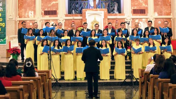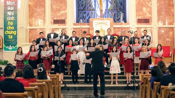 Giáo dân vừa được ca đoàn Cecillia khơi cao niềm hứng khởi vui mừng từ điệp khúc Hallelujaj trong trường ca Messiah, bất chợt được 40 ca viên của ca đoàn Thánh Gia với sự hướng dẫn của ca trưởng Nga đưa vào một thế giới mông lung huyền nhiệm qua bài hợp ca Mầu Nhiệm Của Tình Thương, thơ Xuân Ly Băng, nhạc Kim Long. Bài Thánh Ca này là kết hợp của hai thiên tài Công Giáo. Thi sĩ Công Giáo danh tiếng Xuân Ly Băng là bút hiệu của cố linh mục, đức ông, Gioan Baotixita Lê Xuân Hoa, giáo phận Phan Thiết đã qua đời năm 2017 lúc ngài 91 tuổi sau 58 năm đời linh mục. Hàng trăm bài thơ của Xuân Ly Băng đã được nhiều nhạc sĩ soạn thành ca khúc. Nhạc Kim Long quyện vào Thơ Xuân Ly Băng như sông và nước. Tôi vẫn kính phục tài âm nhạc Thánh Ca của linh mục Kim Long và ví ngài như một Phạm Duy của Thánh Ca Việt Nam. Bài Thánh Ca Kinh Hoà Bình của Kim Long cũng phổ thông như bài Việt Nam-Việt Nam của Phạm Duy. Khi ca đoàn Thánh Gia do ca trưởng Ngọc Linh dịu dàng uyển chuyển dẫn nhịp cất tiếng hát dịu êm “Rừng thời gian lá rụng cây tàn héo cô đơn…” Cả nhà thờ như rơi chìm vào một đêm đông giữa rừng hoang hiu quạnh. Nhưng đến lúc ca đoàn vươn cao lời ca “Trời Bê-lem chớp sáng, khắp trời Bê-lem chớp sáng…..Nhạc Noel réo rắt, khúc nhạc Noel réo rắt, hòa trong gió đêm sương….,” cả giáo đường ấm lên niềm tin vui.