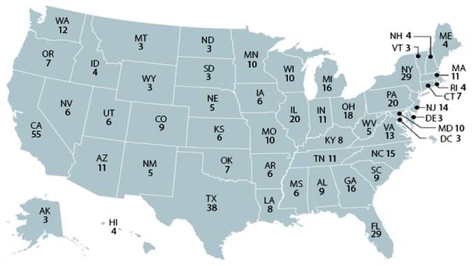Số phiếu Cử Tri Đoàn của từng tiểu bang tại Hoa Kỳ. Tổng số có 538 phiếu (của 50 tiểu bang + DC) cho liên bang Hoa Kỳ.
