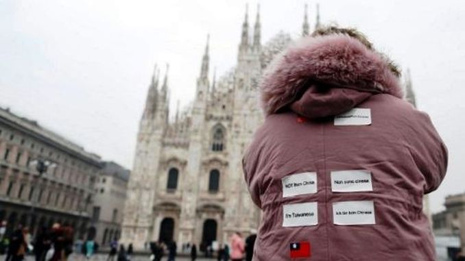 Một du khách Đài Loan tại Milano (Ý) dán trên lưng áo “Tôi không phải người Trung Quốc”, “Tôi là người Đài Loan”… bằng 4 thứ tiếng Anh, Pháp, Đức, Ý. (Ảnh chụp ngày 25/02/2020 của REUTERS/Yara Nardi)