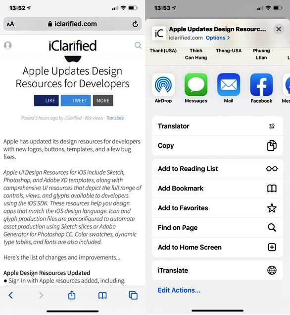 Trong khi bạn đang sử dụng Safari xem trang web, khi nào cần dịch toàn bộ trang sang tiếng Việt, bạn bấm lên nút Share ở phía dưới màn hình trang web. Sau đó, bạn cuộn xuống dưới để chọn mục Translator trong phần biểu tượng hành động (actions) của menu Share.