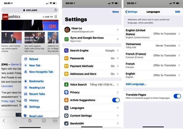 Bước 2: Chạy Google Chrome rồi bấm lên dấu ba chấm (…) ở phía dưới trang web. Sau đó, chọn mục Settings trong menu hiện ra. Trong màn hình kế tiếp, chọn mục Languages rồi chọn các ngôn ngữ đích (from) ở phần trên (nếu cần cài thêm ngôn ngữ nào thì bấm lên mục Add Language…) và gạt thanh chọn của mục Translate Pages sang On (màu xanh). Nếu bạn chưa cài đặt app Google Translate, mục Languages sẽ bị mờ và không cho phép chọn.