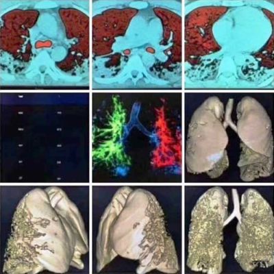 (Hình bên phải là chụp CT 2 lá phổi của một bệnh nhân bị nhiễm Covid-19, khi nó thâm nhập vào phổi thì nó ăn như bầy mối ăn gỗ tới mức mục rỗng và sẽ chết tức tưởi xảy ra. Covid-19 không đơn giản như cảm cúm, xin đừng xem thường nó mà hãy nhớ kỹ rằng, hiện nay trên thế giới chưa có thuốc nào khống chế được virus Covid-19)
