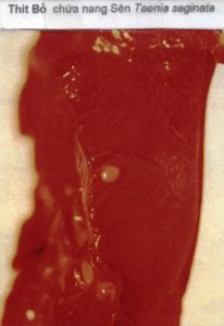 Trong công việc khám thịt hằng ngày tại Canada, thỉnh thoảng tác giả cũng có phát hiện thịt bò bị nhiễm nang ấu trùng sên Taenia saginata. Tại sao? Chúng ta chỉ đoán là có thể có anh Ca Na Điên nào đó trong lúc đi du lịch Á châu hoặc Nam Mỹ, bị nhiễm vì đã ăn thịt bò bít tết chiên không đủ chín, hoặc anh ta có ghé Việt nam làm vài tô phở tái béo kèm theo một dĩa bò tái chanh, mà xui xẻo cho Anh ta là thịt đã được làm từ bò gạo có nang ký sinh trùng Taenia saginata. Trở về lại Canada, một ngày nọ trong lúc làm việc ở nông trại, anh ta cảm thấy đau bụng quá, thay vì chạy đi tìm toilette, anh ta lại giải quyết bầu tâm sự một cách cấp bách ngay tại chỗ trong chuồng bò. Bò bị nhiễm trứng sên vì lẽ đó…