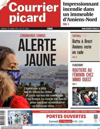 Như thêm vào bức tranh kỳ thị một nét chấm phá lớn, tờ nhật báo hàng đầu của Pháp Courrier Picard, số ra ngày Chủ Nhật 26/1, cho đi trên trang nhất cái tựa “Coronavirus Chinois. Alerte Jaune”. Dịch bệnh corona Trung quốc! Báo động vàng! Đây là một lối chơi chữ đầy tính cách kỳ thị. Tờ báo còn cho đi một bài xã luận mang tên “Một Đại Dịch Vàng Mới?”. Dĩ nhiên dân… vàng nổi tam bành liền. Nhưng người lên tiếng phản đối lại không phải là một dân da vàng. Ông Stéphane Nivet, Tổng Giám Đốc Ligue International Contre Le Racisme et l’Antisemitisme (Liên Minh Quốc Tế Chống Kỳ Thị Sắc Tộc và Bài Do Thái), viết tắt là LICRA, giận dữ nói với tuần báo L’Express ra ngày 28/1: “Việc một tờ báo cho in trên trang nhất dòng chữ như vậy mà không cảm thấy có chi không đúng đã chứng tỏ họ có vấn đề!”. Ngay sau đó, báo Courier Picard đã phải đăng lời xin lỗi.