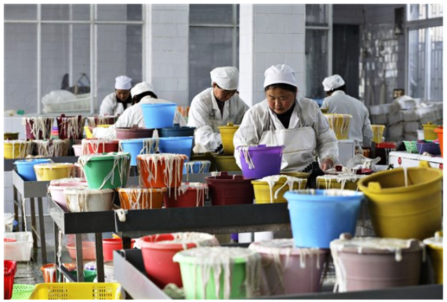 Công nhân phân loại ruột heo trong một nhà máy Trung Quốc. Màng nhầy từ ruột được nấu chín để tạo ra một chất phụ khô được gọi là heparin thô, bước đầu tiên trong việc sản xuất thuốc gọi là heparin (Qilai Shen / Bloomberg từ tập tin Getty Images)