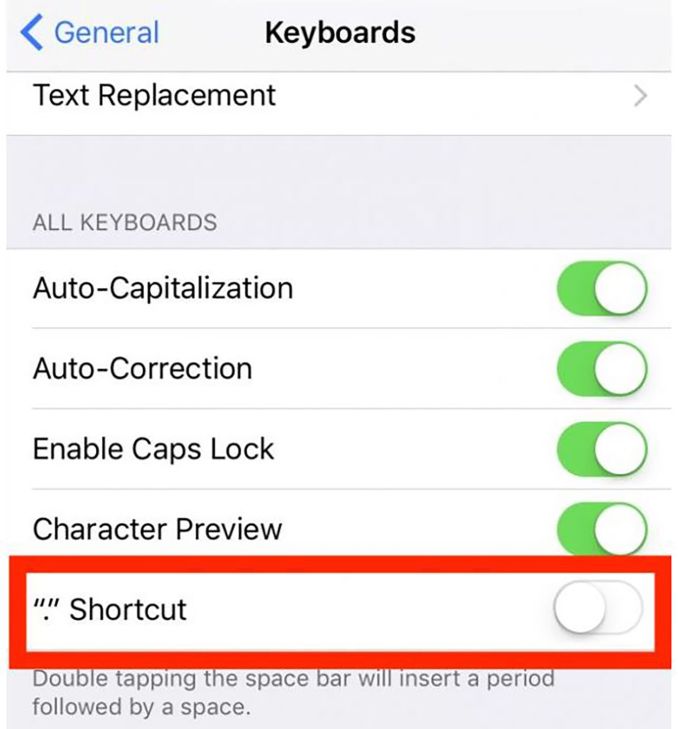 Theo mặc định, iPhone hoặc iPad sẽ tự động nhập dấu chấm ở cuối từ hoặc câu khi bạn bấm kép phím Space mà không cần phải chuyển sang bấm dấu chấm bên bàn phím ký hiệu. Tuy nhiên, nếu bạn không thích như vậy, bạn có thể tắt khả năng này bằng cách vào Settings → General → Keyboard rồi gạt nút [“.” Shortcut] sang Off.