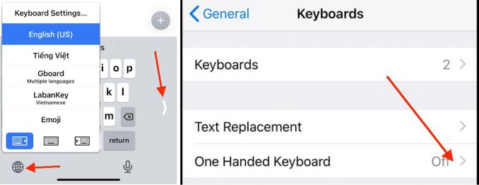 Bàn phím iPhone có thể thu nhỏ về bên trái hoặc phải màn hình để bạn có thể dễ dàng gõ bằng một tay. Bạn chỉ cần bấm và giữ biểu tượng hình quả địa cầu ở trái hoặc phải màn hình rồi bạn chọn bàn phím bên trái hoặc phải trong menu hiện lên. Muốn quay lại bàn phím ở giữa bạn chỉ cần nhấn vào dấu mũi tên lớn ở bên cạnh bàn phím.