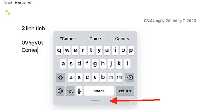 Đối với iPad, bạn chụm hai ngón tay vào giữa bàn phím để thu nhỏ lại thành bàn phím trôi nổi (floating keyboard) rồi kéo và thả bằng thanh ở phía dưới để di chuyển bàn phím này bất cứ nơi nào trên màn hình. Bung hai ngón tay ra trên bàn phím để trở lại kích thước bình thường.